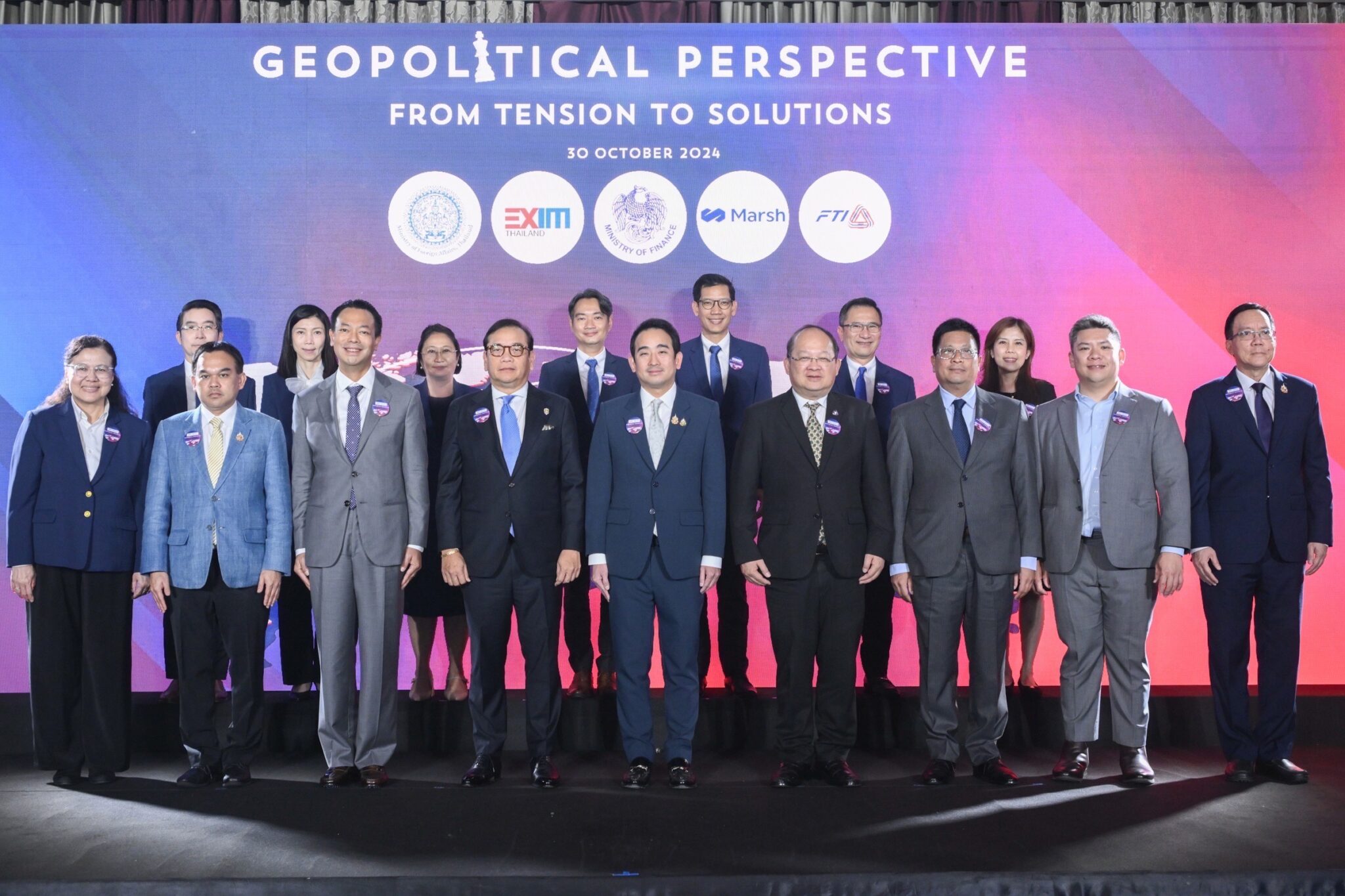 EXIM BANK ร่วมกับบริษัทนายหน้าประกันภัยและที่ปรึกษาความเสี่ยงชั้นนำของโลก “MARSH PB” จัดสัมมนา “Geopolitical Perspective : From Tension to Solutions” เพื่อเสริมสร้างความรู้ความเข้าใจต่อสถานการณ์ความขัดแย้งทางภูมิรัฐศาสตร์ในปัจจุบัน และการใช้เครื่องมือทางการเงินทั้งสินเชื่อและเครื่องมือป้องกันความเสี่ยงขยายโอกาสการค้าการลงทุนโลก ให้แก่ผู้ประกอบการไทยจำนวนกว่า 100 ราย เพื่อนำไปใช้วางแผนธุรกิจให้สามารถรับมือกับปัจจัยท้าทายและสร้างธุรกิจให้เติบโตได้อย่างยั่งยืน โดยมี ดร.เผ่าภูมิ โรจนสกุล รัฐมนตรีช่วยว่าการกระทรวงการคลัง เป็นประธานกล่าวเปิดงาน