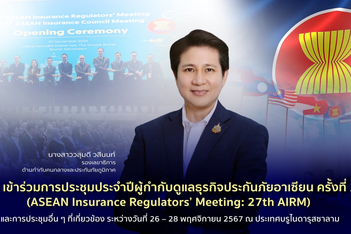 นางสาววสุมดี วสีนนท์ รองเลขาธิการ ด้านกำกับคนกลางและประกันภัยภูมิภาค สำนักงานคณะกรรมการกำกับและส่งเสริมการประกอบธุรกิจประกันภัย (สำนักงาน คปภ.) และคณะผู้แทนสำนักงาน คปภ. เดินทางเข้าร่วมการประชุมประจำปีผู้กำกับดูแลธุรกิจประกันภัยอาเซียน ครั้งที่ 27 (ASEAN Insurance Regulators’ Meeting: 27th AIRM) และการประชุมอื่น ๆ ที่เกี่ยวข้อง ระหว่างวันที่ 26-28 พฤศจิกายน 2567 ณ ประเทศบรูไนดารุสซาลาม ซึ่งจัดขึ้นเป็นประจำทุกปี เพื่อเป็นเวทีในการหารือร่วมกันถึงการส่งเสริมและพัฒนาการกำกับดูแลธุรกิจประกันภัยของภูมิภาค เพื่อกำหนดแนวทางความร่วมมือระหว่างประเทศสมาชิกอาเซียนด้านการพัฒนาและส่งเสริมธุรกิจประกันภัย