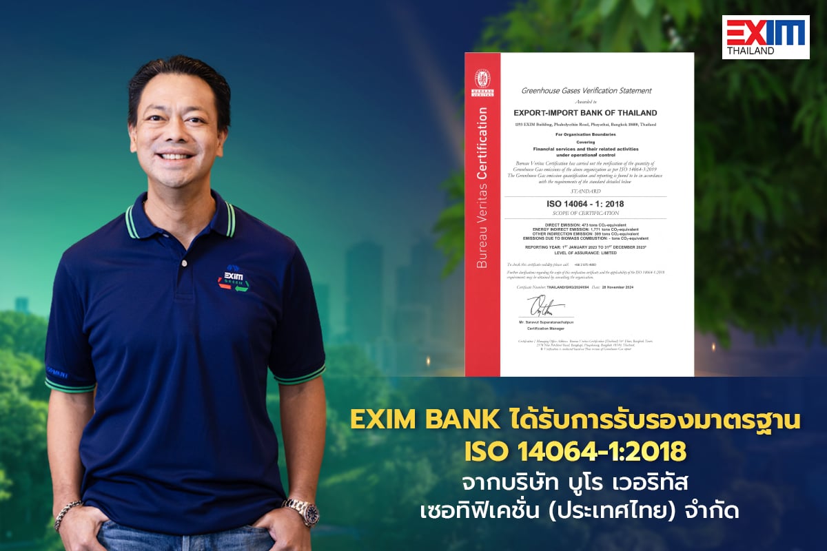 ดร.รักษ์ วรกิจโภคาทร กรรมการผู้จัดการ ธนาคารเพื่อการส่งออกและนำเข้าแห่งประเทศไทย (EXIM BANK) เปิดเผยว่า EXIM BANK ได้รับการรับรองมาตรฐาน ISO 14064-1:2018 ปี 2566 จากบริษัท บูโร เวอริทัส เซอทิฟิเคชั่น (ประเทศไทย) จำกัด ซึ่งเป็นมาตรฐานมอบให้กับองค์กรที่ดำเนินการยกระดับการรายงานและจัดการการปล่อยก๊าซเรือนกระจกได้เทียบเท่าระดับสากล โดย EXIM BANK เป็นสถาบันการเงินเฉพาะกิจของรัฐ (Specialized Financial Institution: SFI) แห่งแรกที่ได้รับการรับรองมาตรฐาน ISO 14064-1:2018