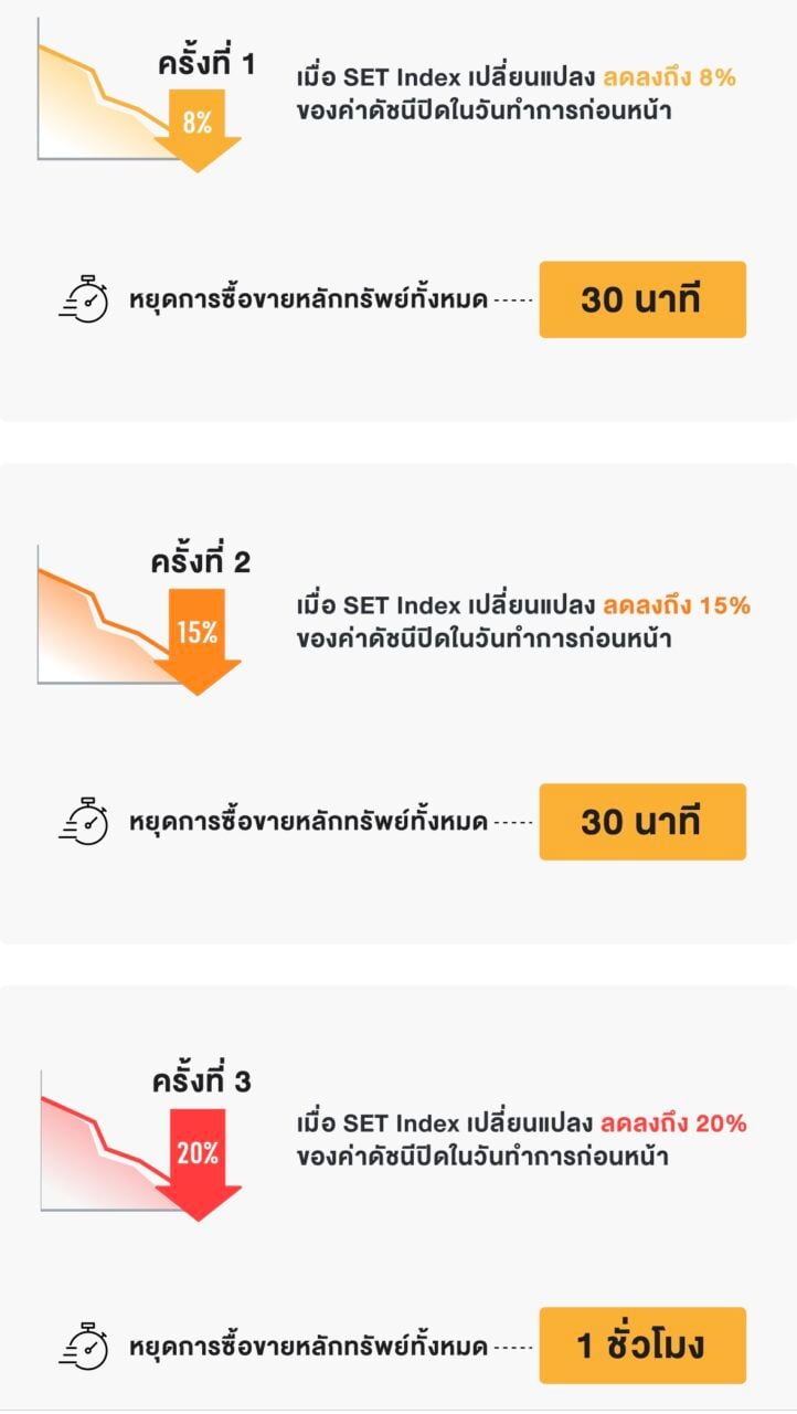ครั้งที่ 1 เมื่อ SETIndex เปลี่ยนแปลงลดลงถึง 8% ของค่าดัชนีปิดในวันทำการก่อนหน้า หยุดการซื้อขายหลักทรัพย์ทั้งหมด 30 นาทีครั้งที่ 2 เมื่อ SETIndex เปลี่ยนแปลงลดลงถึง 15% ของค่าดัชนีปิดในวันทำการก่อนหน้า หยุดการซื้อขายหลักทรัพย์ทั้งหมด 30 นาทีครั้งที่ 3 เมื่อ SETIndex เปลี่ยนแปลงลดลงถึง 20% ของค่าดัชนีปิดในวันทำการก่อนหน้า 1 ชั่วโมง หลังจากการทำงานครั้งที่ 3 ของ Circuit Breaker แล้ว ตลาดหลักทรัพย์จะเปิดให้ทำการซื้อขายต่อไปจนถึงเวลาปิดทำการตามปกติโดยไม่มีการหยุดพักการซื้อขายอีก