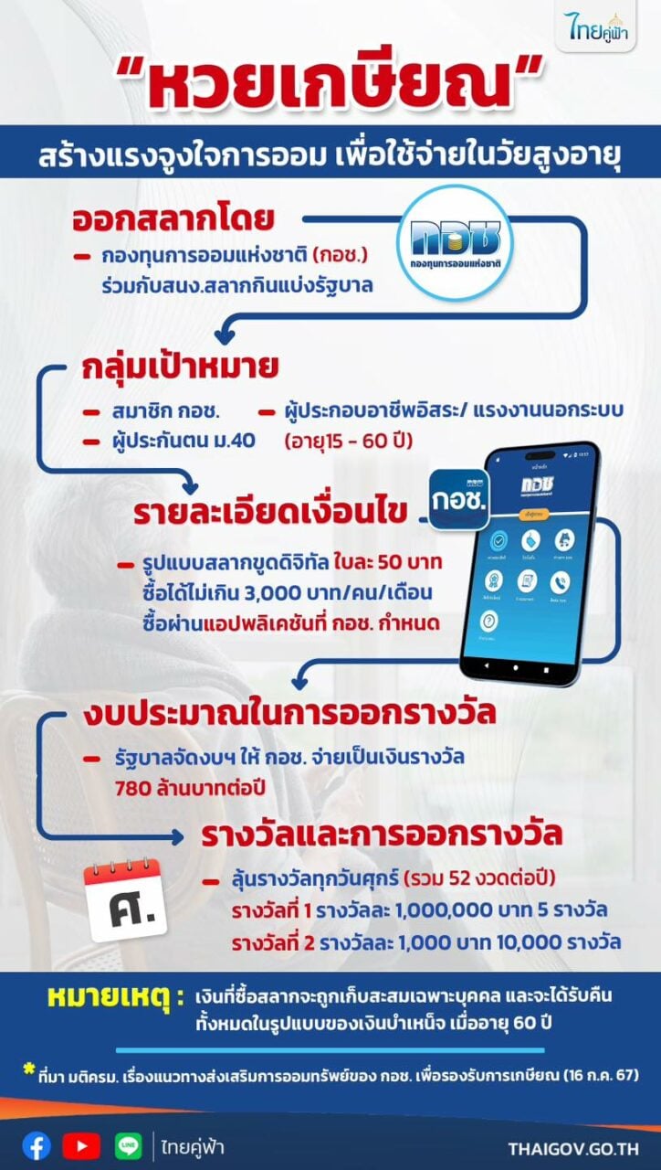 นักวิชาการ ม.ธรรมศาสตร์ สะกิดเตือนรัฐบาล แม้ World Bank จะชม ‘หวยเกษียณ’ สัญญาณบวกสร้างวินัยการออมโดยไม่บังคับ แต่ต้องระวังไม่ให้กลายเป็น “นโยบายการพนันที่แฝงมากับการออม” เสนอผลักดันร่วมกับพัฒนาระบบบำนาญถ้วนหน้าเดือนละ 2พันบาท ยกเคสตัวอย่าง“บำนาญ 3 เสาหลัก”ของสวิสเซอร์แลนด์ ยกระดับคุณภาพชีวิตผู้สูงวัย