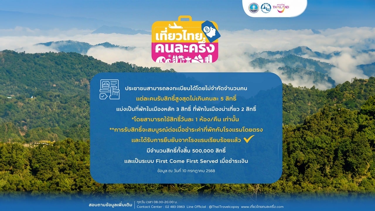 การท่องเที่ยวแห่งประเทศไทย (ททท.) เปิดการลงทะเบียนสำหรับประชาชนที่ต้องการเข้าร่วมใช้สิทธิ์โครงการ“เที่ยวไทยคนละครึ่ง”ตั้งแต่วันที่10กรกฎาคม2568เป็นต้นไป หลังจากปรับปรุงพัฒนาระบบที่เกี่ยวข้องเป็นที่เรียบร้อยแล้ว โดยประชาชนที่สนใจสามารถลงทะเบียนเข้าร่วมโครงการเที่ยวไทยคนละครึ่งได้ทางแอปพลิเคชันAmazing Thailandหรือhttps://www.เที่ยวไทยคนละครึ่ง.comพร้อมชี้แจงประเด็นการดำเนินโครงการอย่างโปร่งใสและให้ความสำคัญต่อความปลอดภัยในการใช้งานของผู้ใช้บริการ