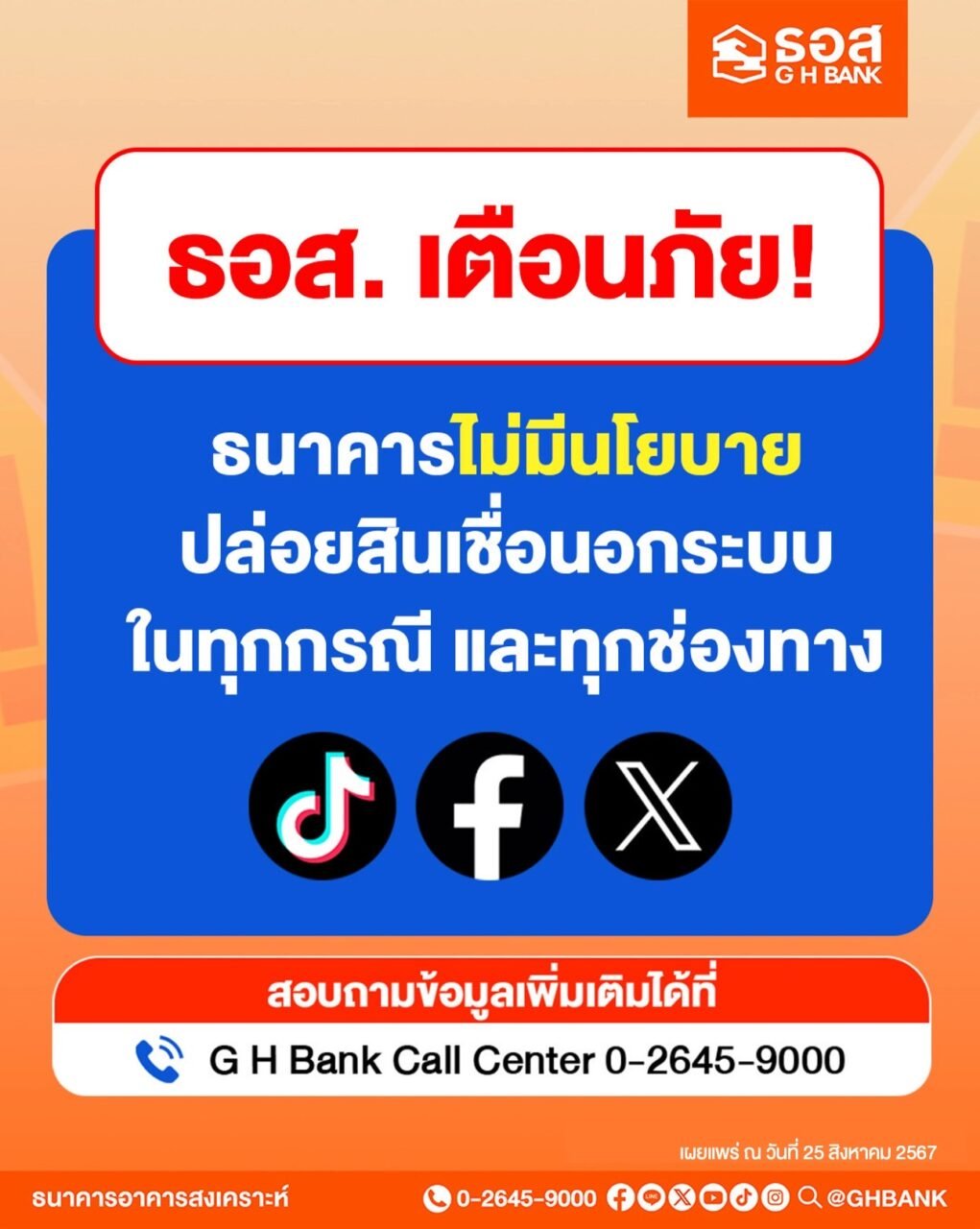 ทั้งนี้เพื่อให้ประชาชนได้รับข้อมูลข่าวสารที่ถูกต้องของธนาคารอาคารสงเคราะห์สามารถติดตามได้ที่www.ghbank.co.thหรือG H Bank Call Centerโทร0-2645-9000และFacebook Fanpageธนาคารอาคารสงเคราะห์