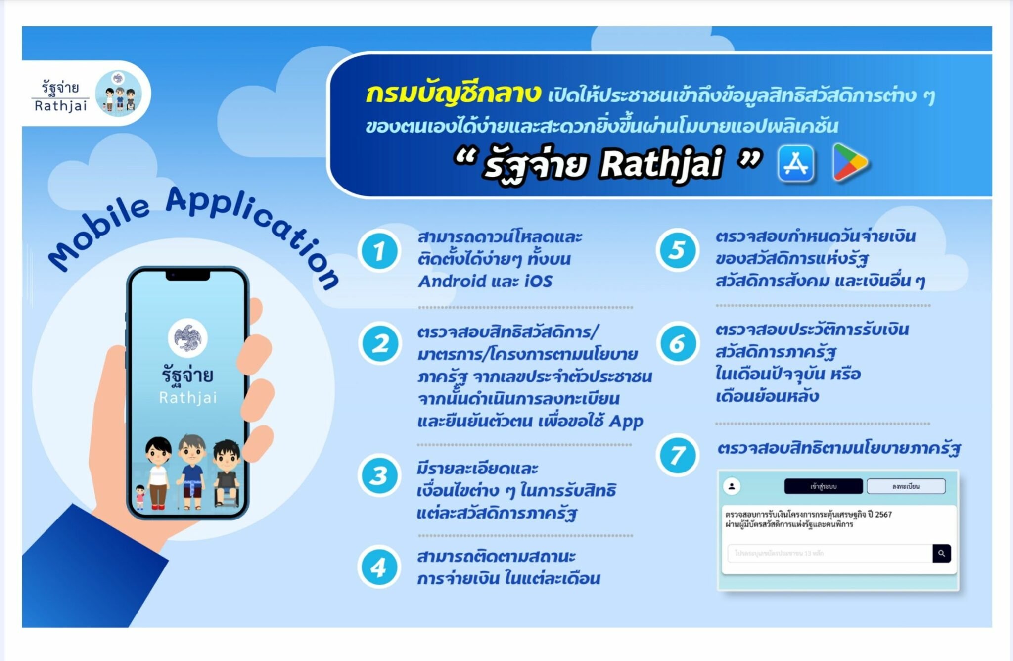 ตลอดจนสามารถติดตามสถานะ การจ่ายเงิน ในแต่ละเดือน กำหนดวันจ่ายเงินของสวัสดิการแห่งรัฐ สวัสดิการสังคม และเงินอื่นๆ ตรวจสอบประวัติการรับเงิน สวัสดิการภาครัฐ ในเดือนปัจจุบัน หรือ เดือนย้อนหลัง และตรวจสอบสิทธิตามนโยบายภาครัฐ