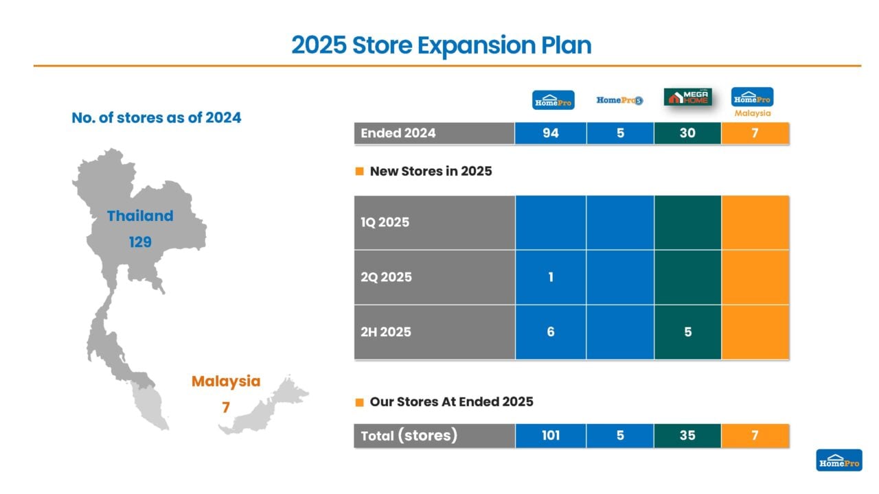 ทั้งนี้ สาขาใหม่ 12 แห่งนั้น จะเป็นโฮมโปร 7 แห่งและเมกาโฮม 5 แห่ง ซึ่งประกอบเป็นสาขารูปไฮบริดที่รวมโฮมโปรและเมกาโฮม 6-8 แห่ง ส่งผลให้สิ้นปีนี้บริษัทมีสาขารวมทั้งหมด 130 แห่ง เพิ่มจากสิ้นปี67 ที่มีโฮมโปร 96 แห่ง,โฮมโปรเอส หรือสาขาเล็ก 5 แห่ง,เมกาโฮม 30 แห่ง และโฮมโปรในประเทศมาเลเซีย 7 แห่ง