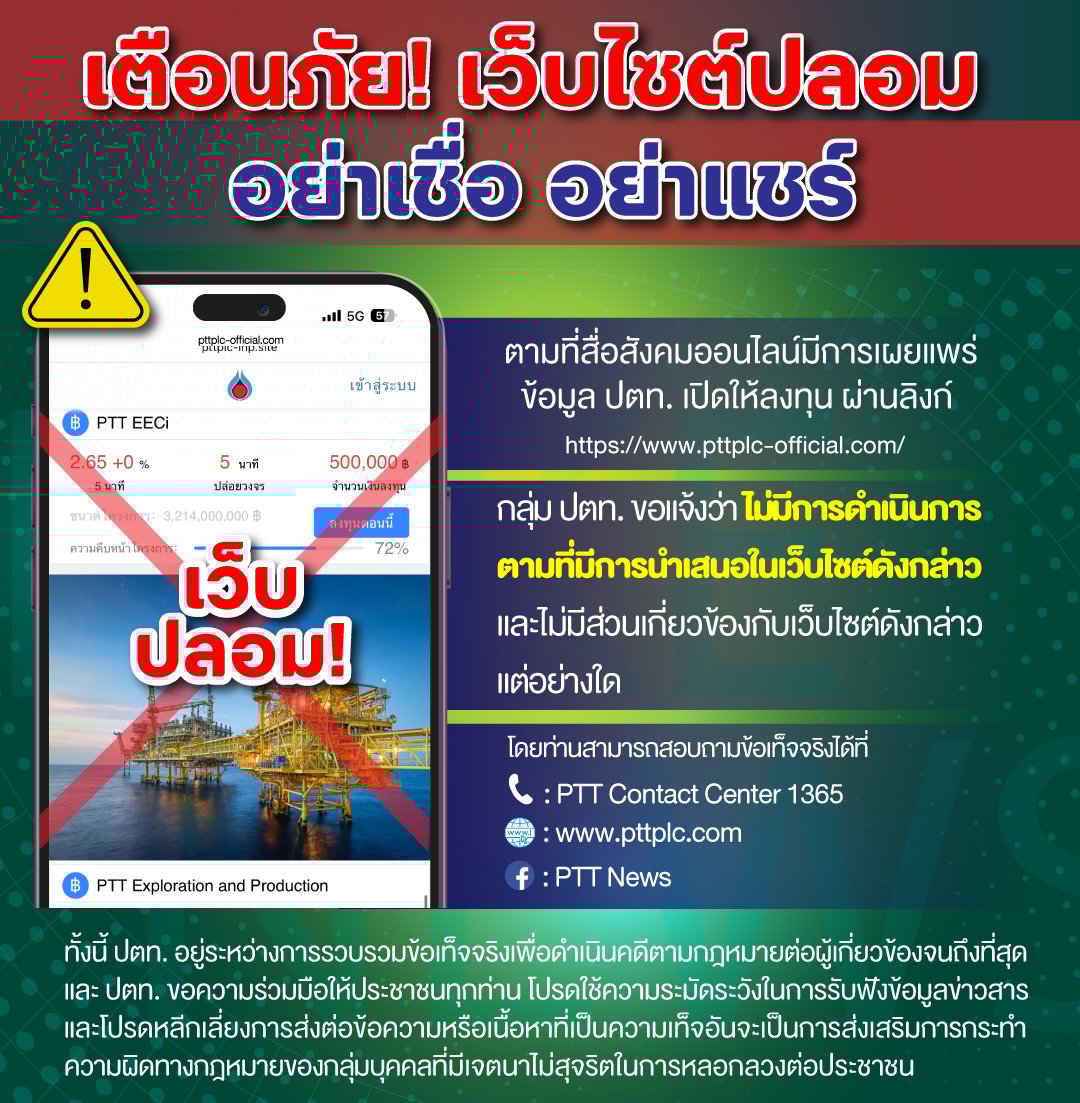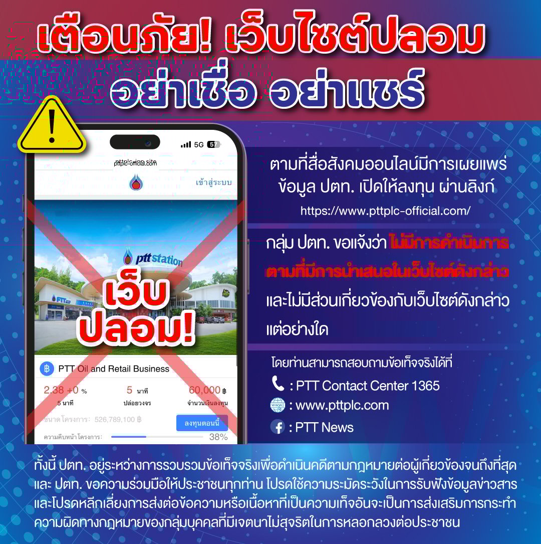 ตามที่สื่อสังคมออนไลน์มีการเผยแพร่ข้อมูล ปตท. เปิดให้ลงทุน ผ่านลิงก์ https://www.pttplc-official.com/ นั้น กลุ่ม ปตท. ขอแจ้งว่า กลุ่ม ปตท. ไม่มีการดำเนินการตามที่มีการนำเสนอในเว็บไซต์ดังกล่าว และไม่มีส่วนเกี่ยวข้องกับเว็บไซต์ดังกล่าวแต่อย่างใด โดยท่านสามารถสอบถามข้อเท็จจริงได้ที่ โทรศัพท์ PTT Contact Center 1365 และติดตามข่าวสารได้จากเวปไซต์ https://www.pttplc.com และ Facebook Fanpage : PTT News https://www.facebook.com/PTTNews