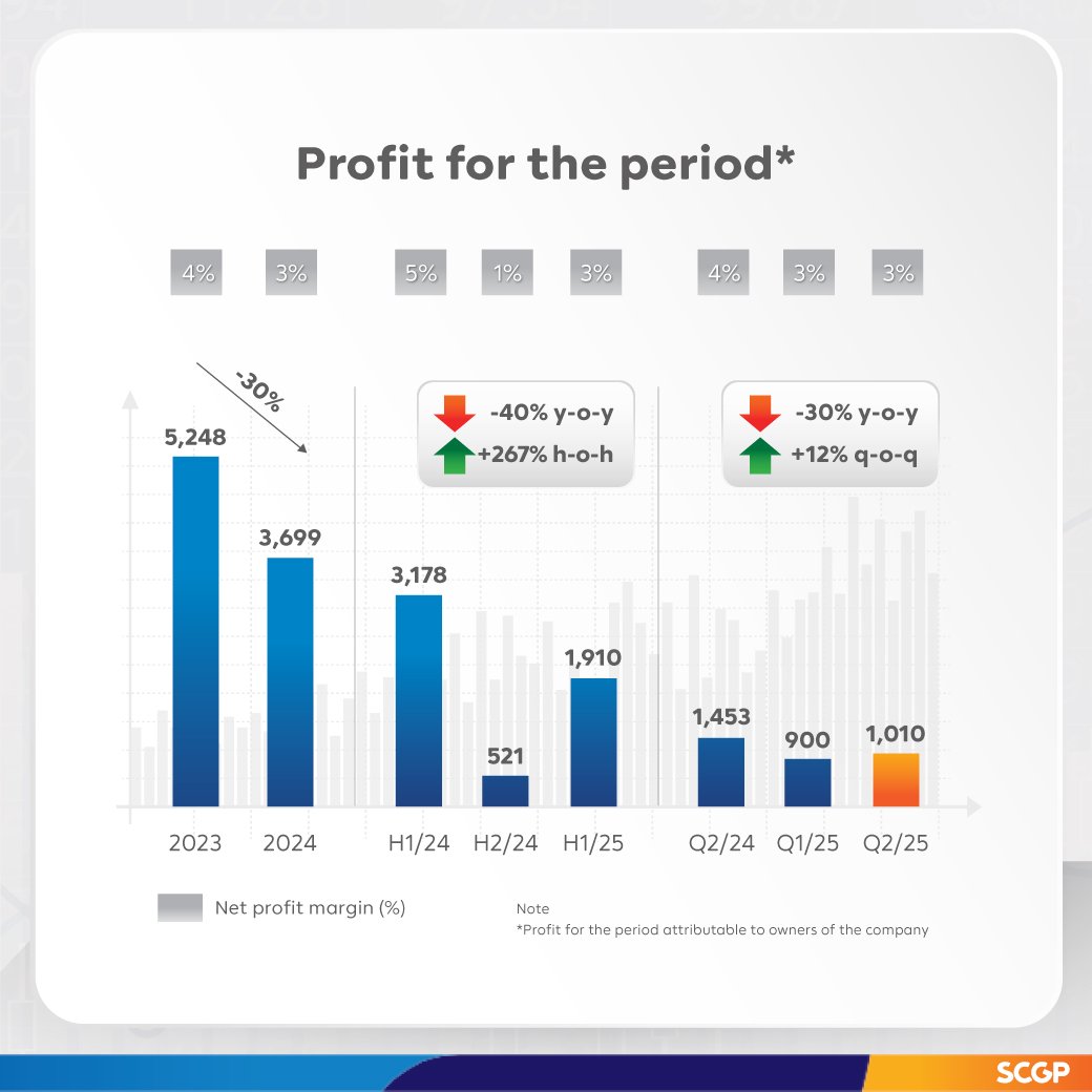 SCGP ได้วางกลยุทธ์เติบโตภายในประเทศอาเซียนอย่างต่อเนื่อง มุ่งเน้นการตลาดเชิงรุกผ่านโซลูชันบรรจุภัณฑ์ที่ตอบโจทย์ผู้บริโภคส่งผลให้ปริมาณการขายสินค้ากลุ่มธุรกิจบรรจุภัณฑ์ครบวงจรโดยเฉพาะในเวียดนามเพิ่มขึ้นต่อเนื่อง แม้ราคาส่วนใหญ่ยังทรงตัว ส่วนกลุ่มธุรกิจเยื่อและกระดาษ ปริมาณการขายลดลงจากความต้องการที่ชะลอตัวในกลุ่มอุตสาหกรรมสิ่งทอและเครื่องนุ่งห่ม ขณะเดียวกัน บริษัทฯ ได้เน้นบริหารต้นทุนอย่างมีประสิทธิภาพและยั่งยืน ด้วยการใช้ AIและ Machine Learningตลอดทั้งห่วงโซ่คุณค่า โดยเฉพาะธุรกิจในอินโดนีเซียที่เริ่มนำ AI มาปรับใช้ และปรับสัดส่วนการใช้พลังงาน รวมถึงเพิ่มการใช้วัตถุดิบกระดาษรีไซเคิล (RCP) ภายในประเทศ และบริหารต้นทุนทางการเงินอย่างมีประสิทธิภาพ ทำให้ EBITDA ถึงจุดคุ้มทุนตามเป้าหมาย และส่งผลดีต่อภาพรวมผลการดำเนินงานของบริษัทฯ ทำให้ในไตรมาส 2 ปี 2568 SCGP มีรายได้จากการขาย 31,557 ล้านบาท ลดลงร้อยละ 2 EBITDA 4,257 ล้านบาท เพิ่มขึ้นร้อยละ 1 และกำไรสำหรับงวด1,010 ล้านบาท เพิ่มขึ้นร้อยละ 12 เมื่อเทียบกับไตรมาส1 ปี 2568